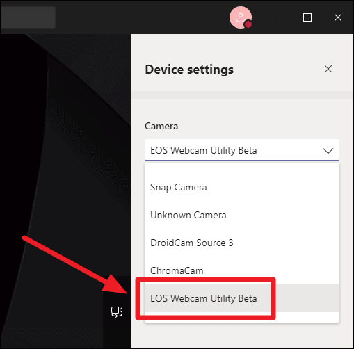 Note: If you don't see the 'EOS Webcam Utility' in the list, restart the Microsoft Teams application.