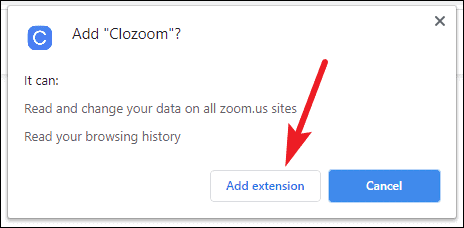 A confirmation dialog box will appear, with the disclaimer that the extension can read and change your data on zoom.us sites, and asking for permission to install the extension. Click on ‘Add extension’ to install it.