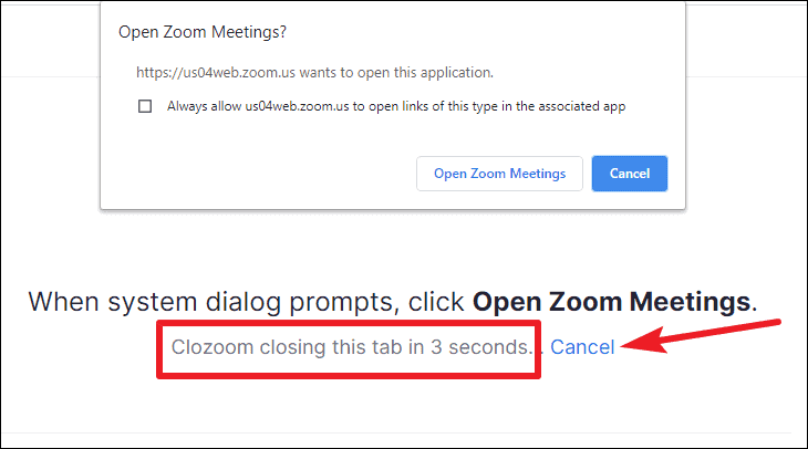 Once you install the extension, it will work automatically on all Zoom links. When you click on a meeting link, you’ll see the 3-second countdown by Clozoom on the page. Click on the ‘Cancel’ option next to it if you don’t want Clozoom to close that certain tab. Otherwise, Clozoom will close the tab within 3 seconds.