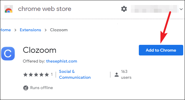 Go to the Chrome web store and search for ‘Clozoom’. You can also click the link here to open it directly. Then, click the ‘Add to Chrome’ button on the right side of the screen.