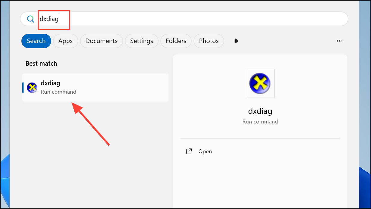 Step 1: Open the Start menu and type dxdiag in the search bar. Select the DxDiag app from the results and confirm any prompts to launch the tool.