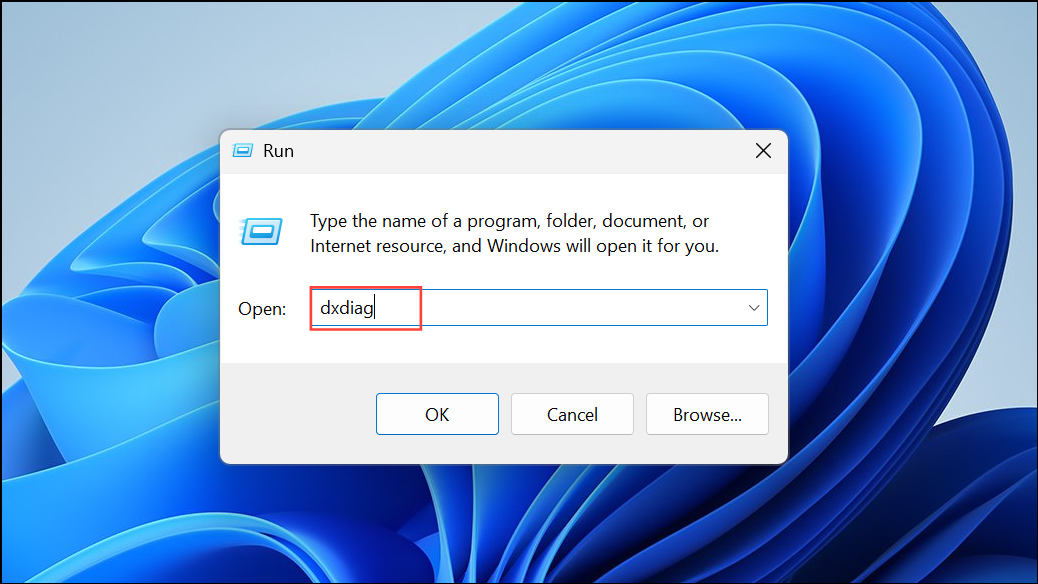 Step 2: If the search method does not work, open the Run dialog by pressing Windows + R on your keyboard. Enter dxdiag and press Enter. This command triggers Windows to gather system and driver information, then opens the DxDiag window.