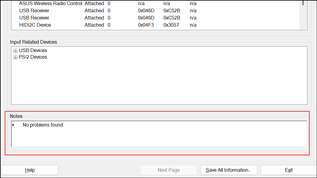 Review the “Notes” section at the bottom of each tab for immediate feedback on detected issues. If all tabs report “No problems found,” your hardware and drivers are functioning correctly as recognized by Windows.
