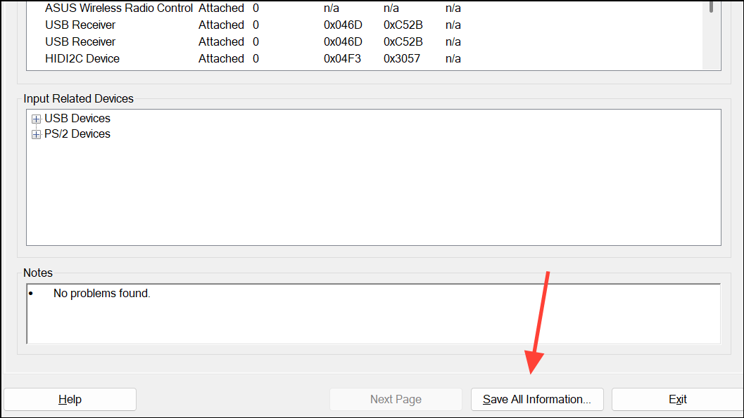 Step 1: After reviewing the information, click Save All Information at the bottom of the DxDiag window.