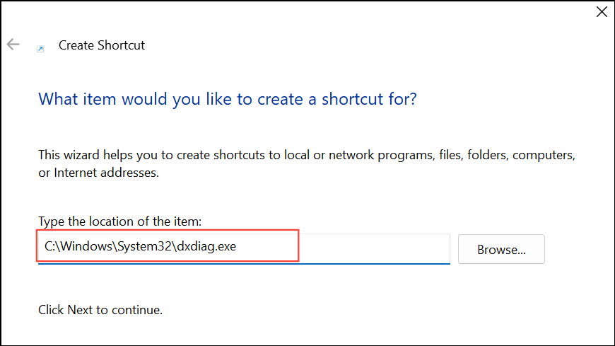 Right-click the desktop, select New > Shortcut, and enter C:\Windows\System32\dxdiag.exe as the location. Name the shortcut and use it for quick access.