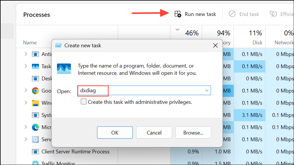 Open Task Manager with Ctrl + Shift + Esc, click File > Run new task, type dxdiag, and confirm. This method is useful if the Start menu or search bar is unresponsive.