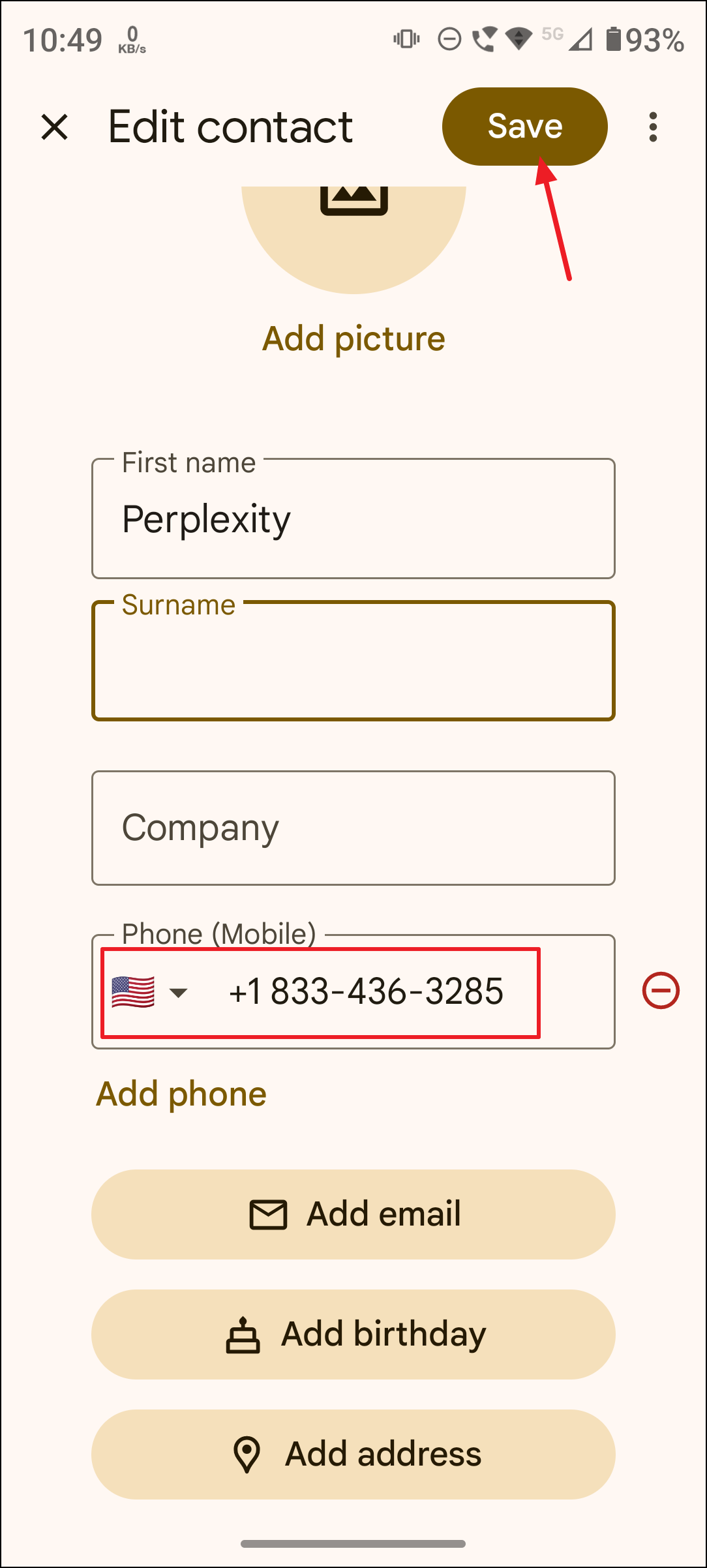 Step 1: Save the phone number +1 (833) 436-3285 to your contacts list. Assign it a name like Perplexity for easy identification. This enables WhatsApp to recognize the contact and allows you to initiate a chat.