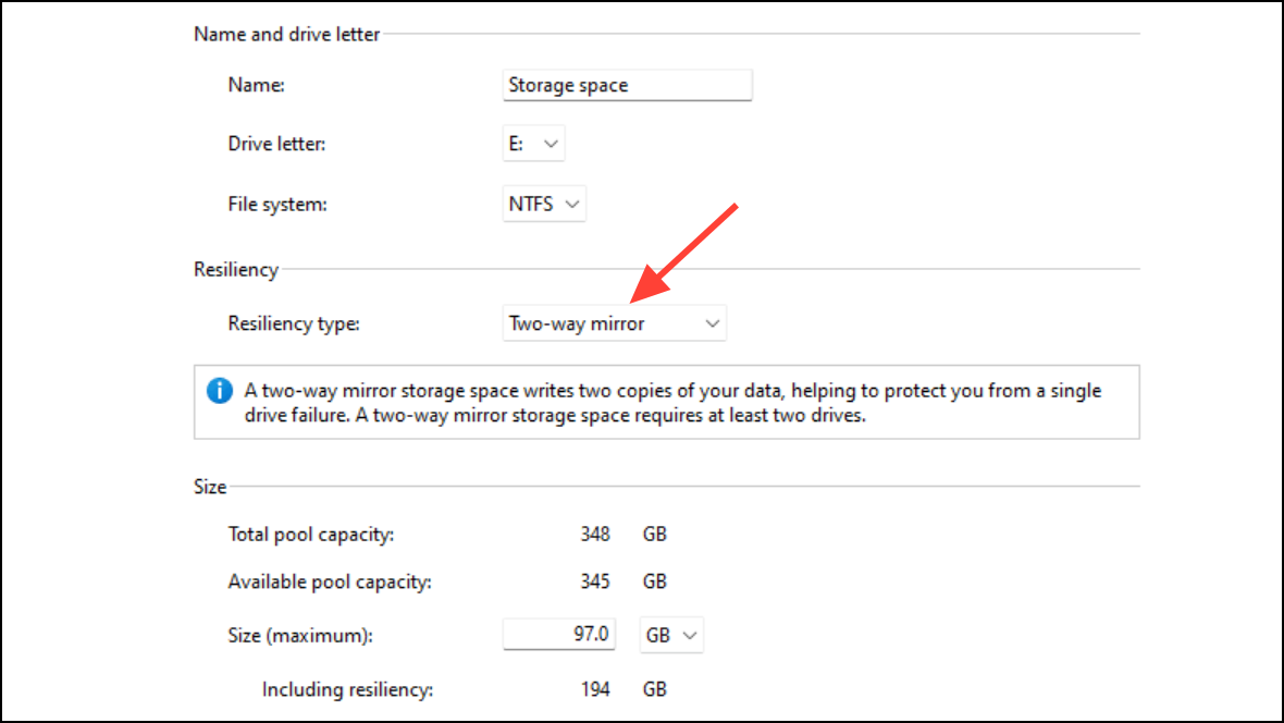 - Mirror spaces (two-way or three-way) duplicate data across drives, protecting against one or two drive failures, respectively. This option is ideal for safeguarding important files and general-purpose storage.
