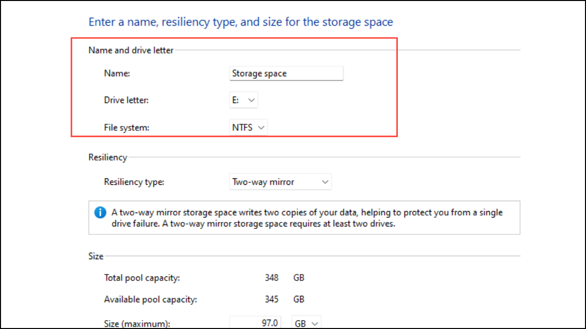 Step 4: Assign a name, drive letter, and file system (NTFS or ReFS) for the new storage space. ReFS (Resilient File System) is recommended for improved data integrity, particularly when using mirror spaces.