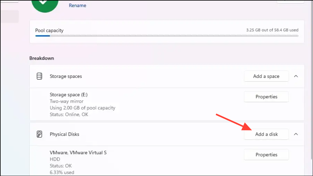 Step 3: Select your existing storage pool, then under Physical Disks, click Add a disk.