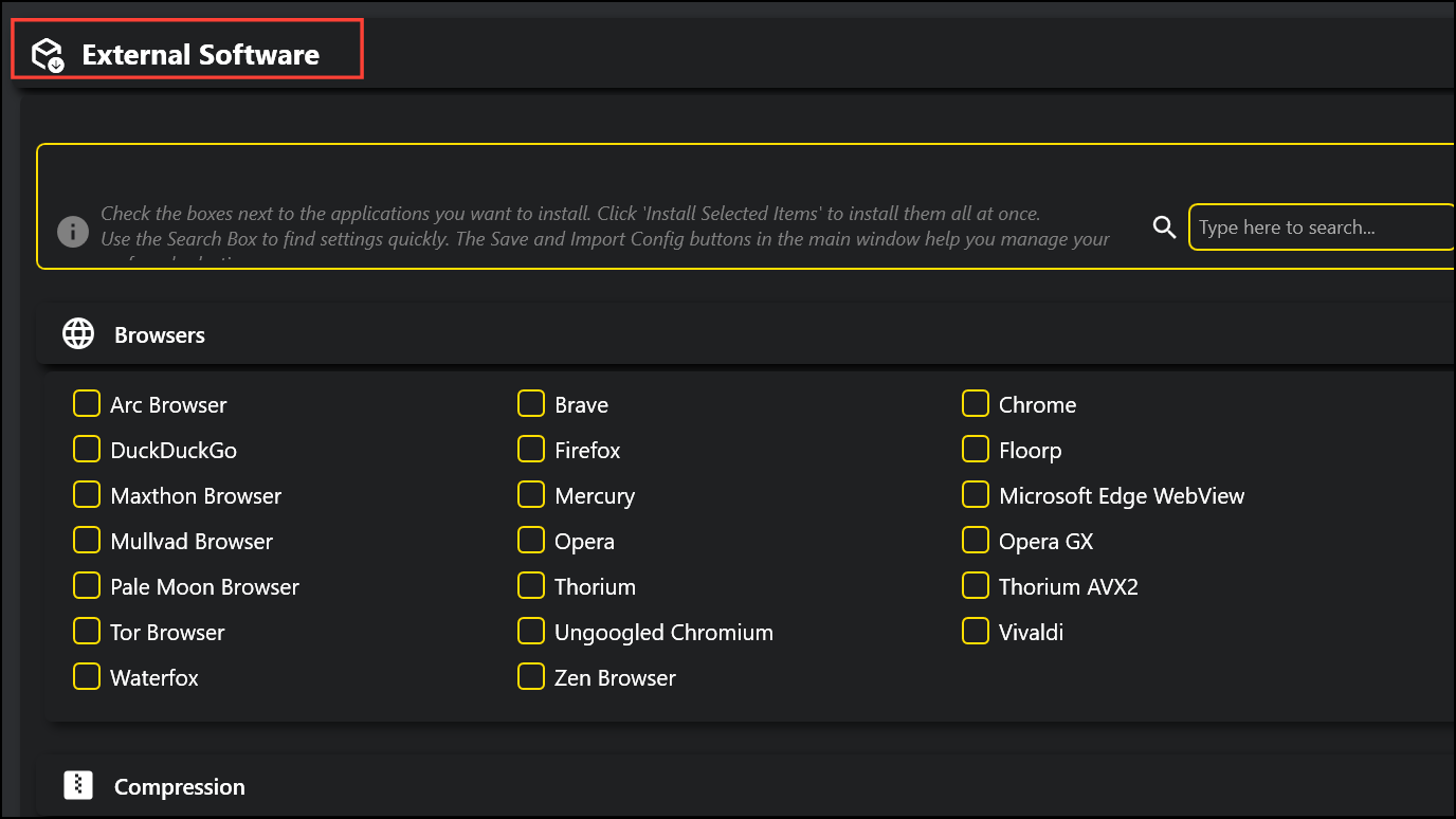 Step 1: In the External Software section, browse categories such as browsers, multimedia tools, document viewers, productivity apps, and security utilities.