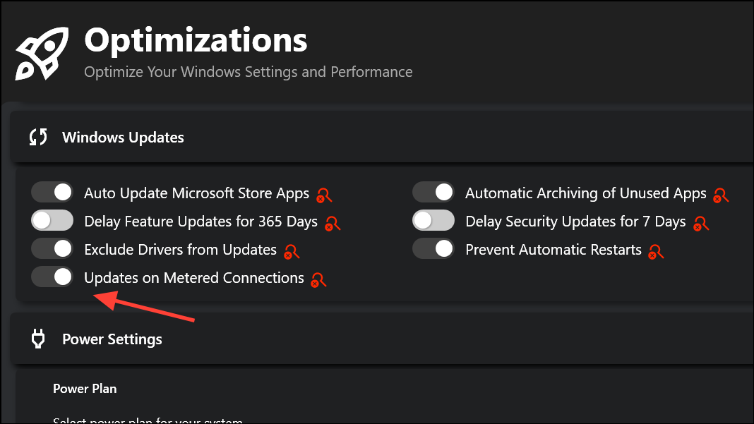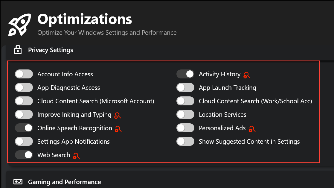 Step 1: Open the Optimize tab in Winhance. Here, you’ll find grouped controls for security, privacy, gaming, updates, and power settings, each with explanatory tooltips and toggle switches.