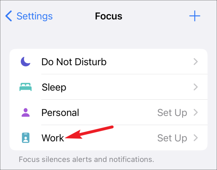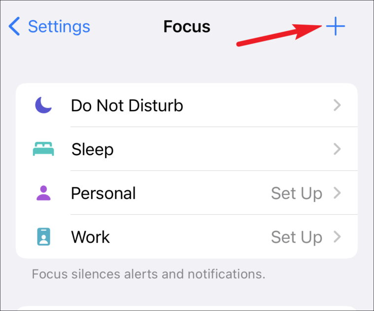 Depending on what you want to set up the Focus mode for first, tap that option. The options for Work and Personal Focus will be visible straight away. For other options like, tap the ‘+’ in the top-right corner.