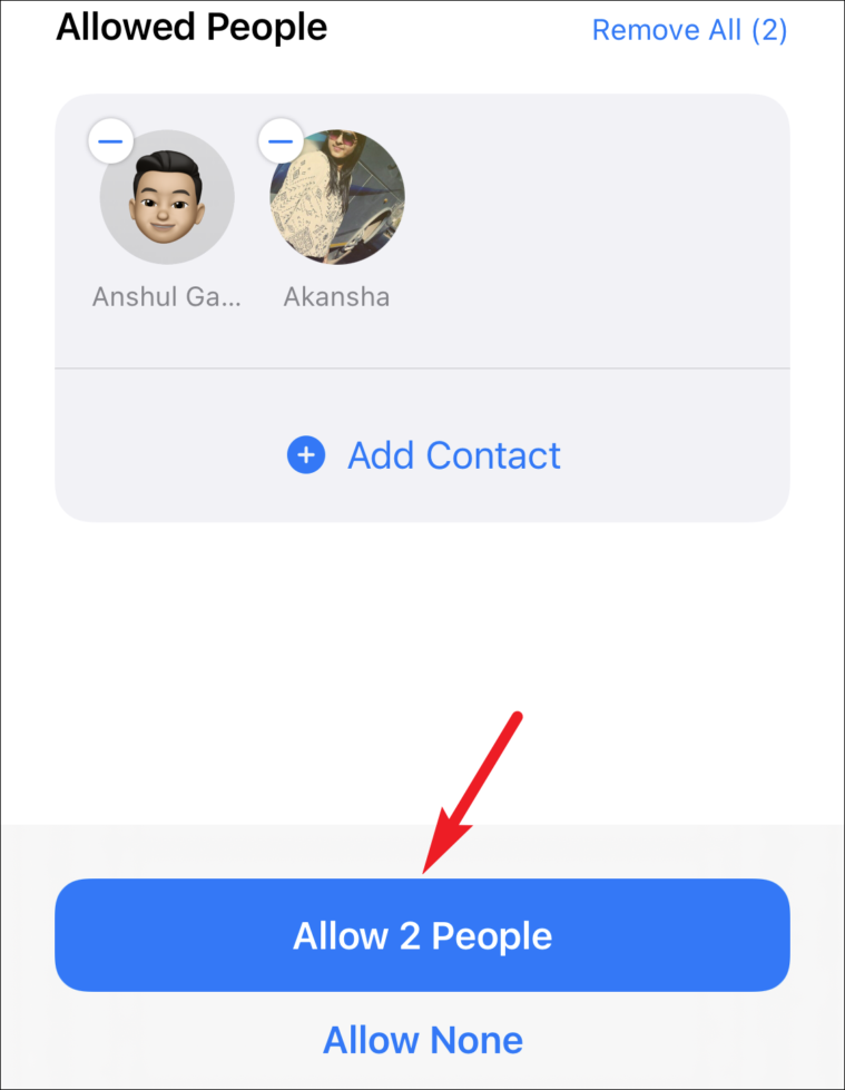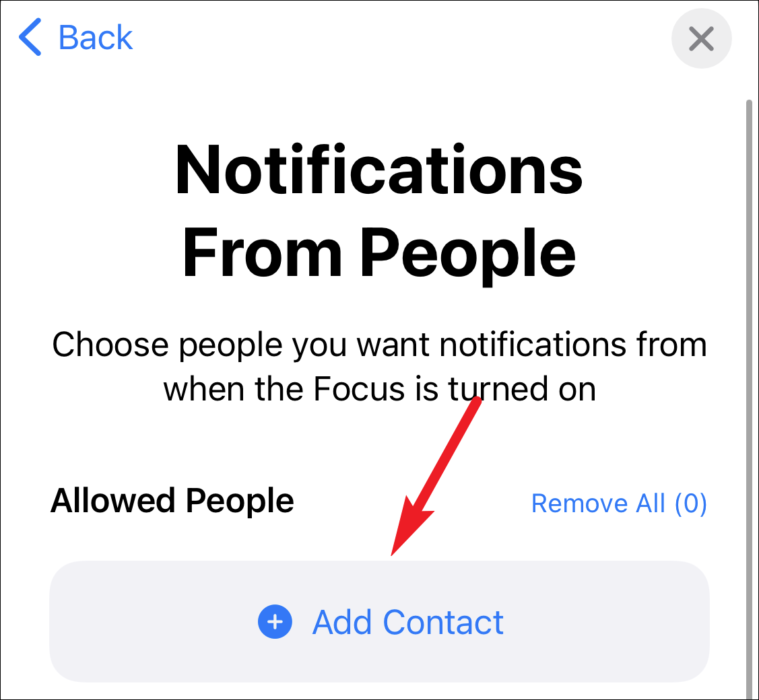 Tap ‘Add Contact’ to add the people from whom you still want to receive notifications even when Focus is turned on. You can also tap ‘Allow None’ to move forward without allowing notifications from anyone.