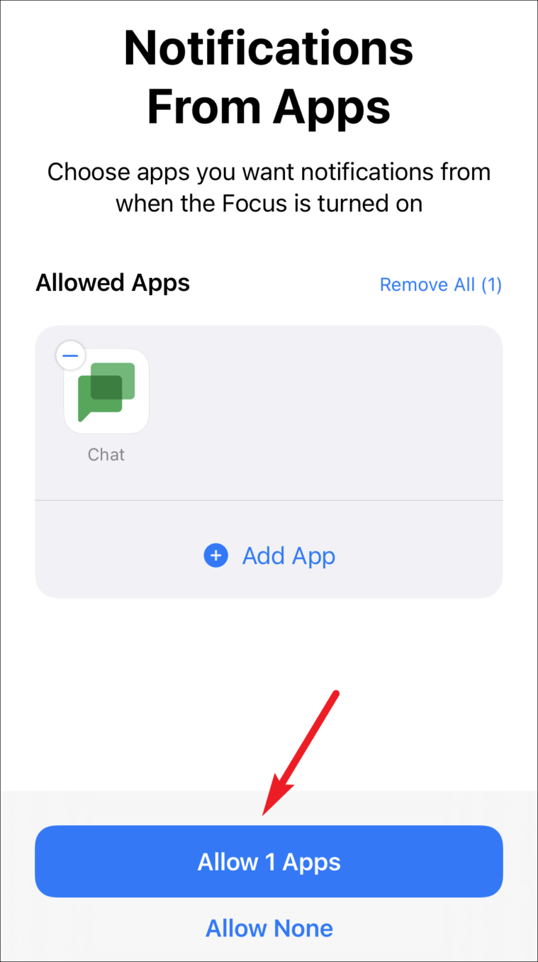 Then, add any apps you don’t want to silence notifications for in Work Focus. These could be your work apps like Microsoft Teams, Webex, Zoom, etc. – basically any apps you want to allow.Tap ‘Allow <n> Apps’ after adding the apps or ‘Allow none’ to silence notifications from all the apps.