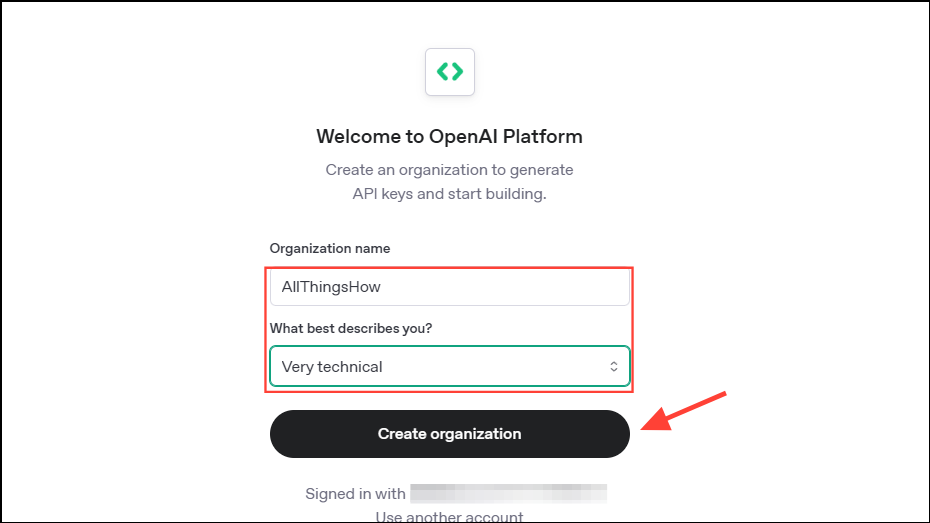 - Type in the name you want to use for your organization and select the level of technical knowledge from the dropdown. Then click the 'Create organization' button.