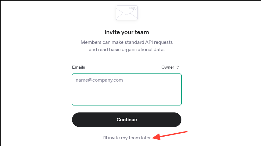 - If you want, you can invite other users to your organization by typing their email addresses in the provided box. To skip this step, just click the 'I'll invite my team later' option at the bottom.
