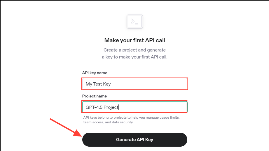 - Now, provide a name for your API key and the project before clicking the 'Generate API Key' button.