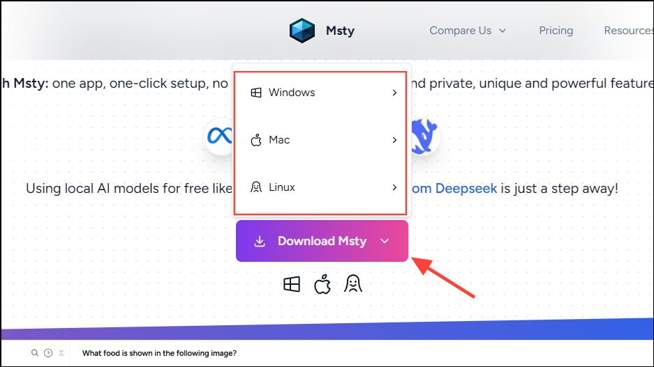 - Click the 'Download Msty' button and select the platform you want to use it on. Make sure you select the right CPU and GPU from the available options.