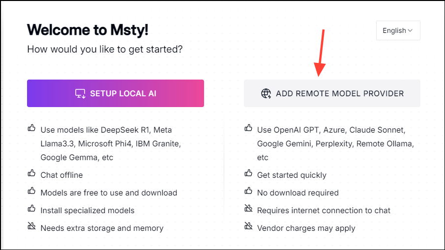 - Once the installer is downloaded, open it and the app will start installing by itself. After the installation is complete, the app will open. Click the 'Add Remote Model Provider' button on the right.