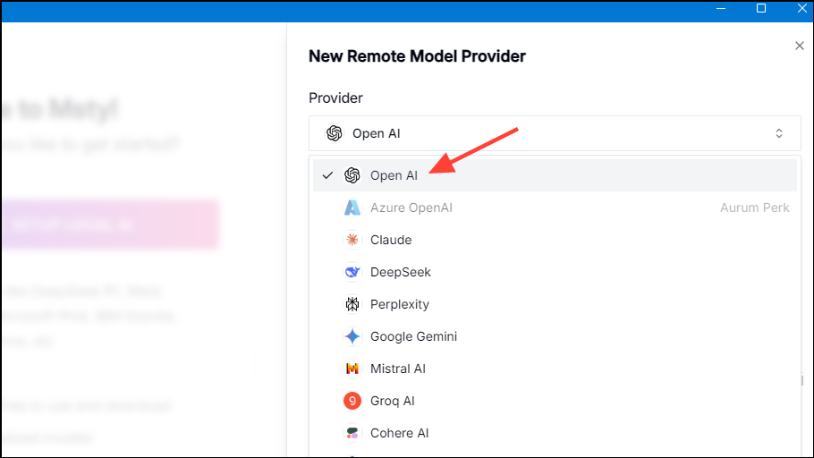 - On the next page, click the dropdown at the top and select 'OpenAI' if it is not already selected by default.