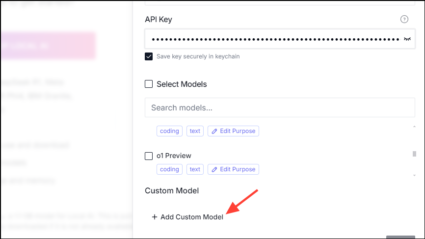 - Now, you will see the various AI models from OpenAI that you can use below the 'Search models' search box. However, since GPT-4.5 has only just been released, it won't show up here. So, click the 'Add custom model' button at the bottom.