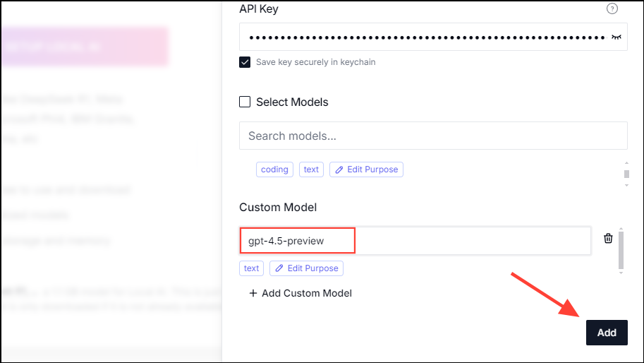 gpt-4.5-previewin the new text field that appears and click the 'Add' button at the lower right corner.