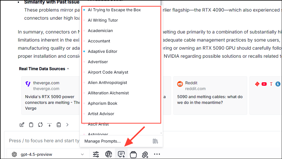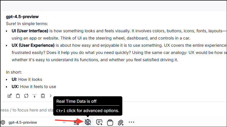 - The latest data that GPT-4.5 has access to is from October 2023. If you want to get the latest information, make sure to enable the 'Real Time Data' option from the bottom.