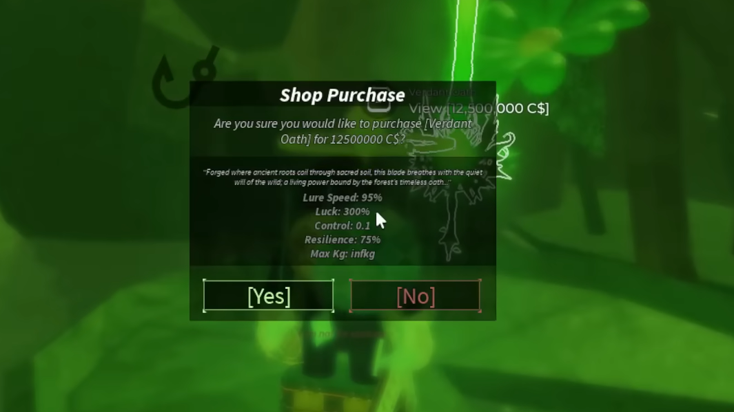 Verdant Oath is not a grab-and-go rod. It is a locked Living Garden purchase with a 12.5 million C$ cost, a strict bestiary gate, and one of the stronger stat packages in the Lost Jungle update. If the buy prompt is still refusing you, the fix is simple even if the grind is not: finish the required Lost Jungle bestiary progress, return to the rod behind Nectar Koi, and buy it there.