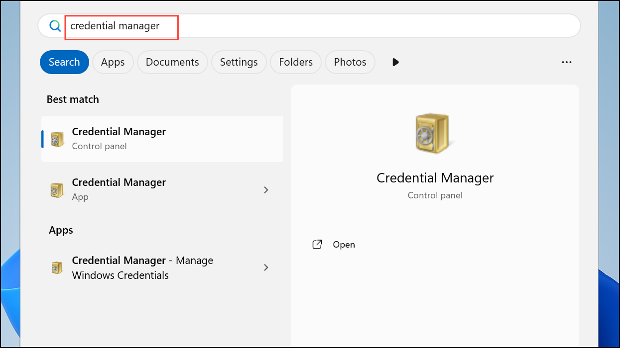 Step 1: Press the Start button or tap the Windows key on your keyboard. In the search bar, type Credential Manager and select it from the results. This opens the Windows Credential Manager—an integrated tool that stores login details for websites, network shares, and applications.