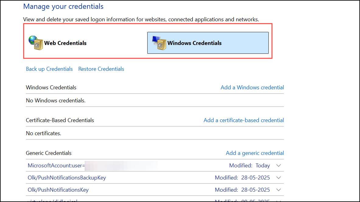 Step 2: In the Credential Manager window, you’ll see two tabs: Web Credentials and Windows Credentials. Web Credentials lists passwords saved for websites and web-based apps, while Windows Credentials stores details for network resources and Windows services.