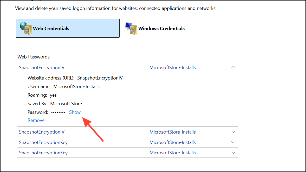 Step 3: Click on the relevant credential to expand its details. For web credentials, click the entry and then click the Show button next to the password field. For security, you’ll be prompted to enter your Windows account password or PIN before the password is revealed.