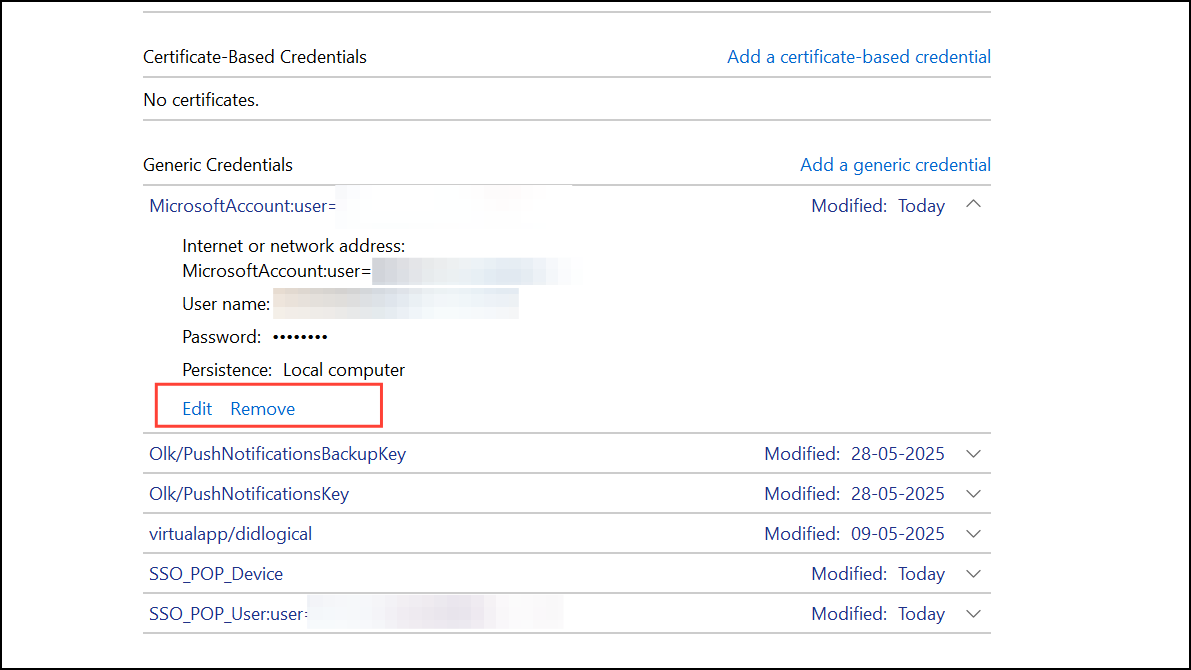 Step 4: After authentication, the password appears in plain text. You can use the Edit option to update the password or Remove to delete the credential. Note that some credentials, especially those encrypted by Windows, may not offer a Show option and can only be edited or removed.