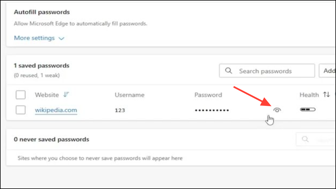 Step 3: A list of saved website passwords appears. Each entry includes the website, username, and a masked password. To view a password, click the eye icon next to it. For security, Edge will require you to authenticate using your Windows password, PIN, or Windows Hello (face or fingerprint recognition).