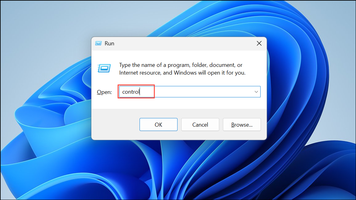 Step 1: Press Windows + R to open the Run dialog, type control, and press Enter. This opens the Control Panel.