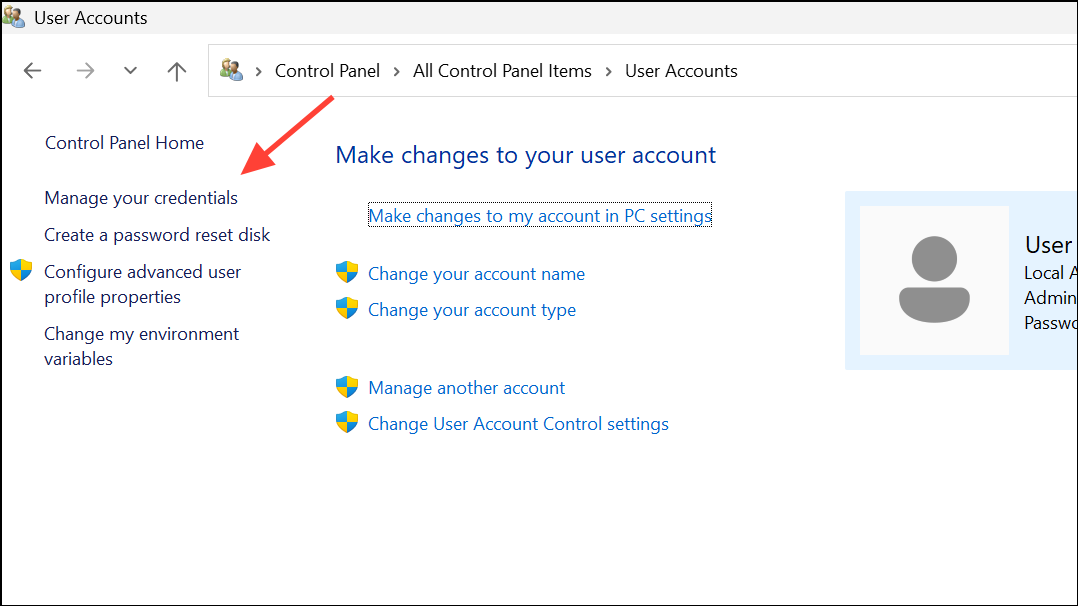 Step 2: Click on User Accounts, then select Credential Manager. Here, you’ll find both Web Credentials and Windows Credentials just as in the dedicated Credential Manager app.