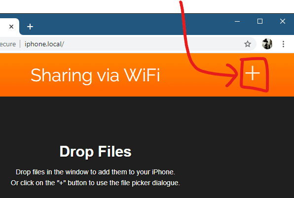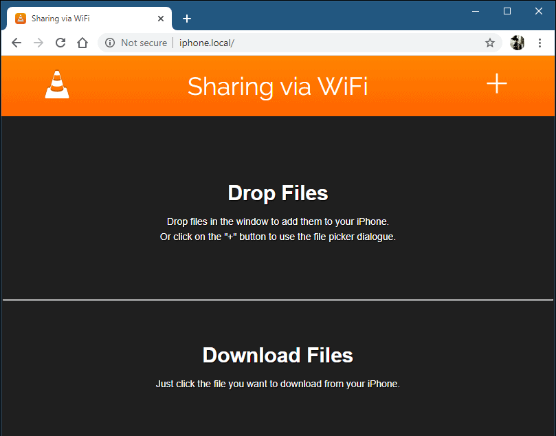 To upload/transfer a file from your PC to your iPhone, you can either drag and drop the file into the window, or click on the Plus (+) button at the top-right corner of the VLC web interface screen to select a file from your PC and transfer it to the iPhone wirelessly without using internet.
