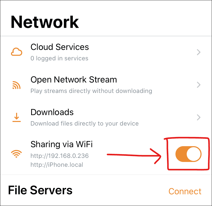 Make note of the local IP address displayed below the “Sharing via WiFi” option in the VLC app. Or you could use the http://iphone.local link to launch the local web server created by VLC app on your iPhone.