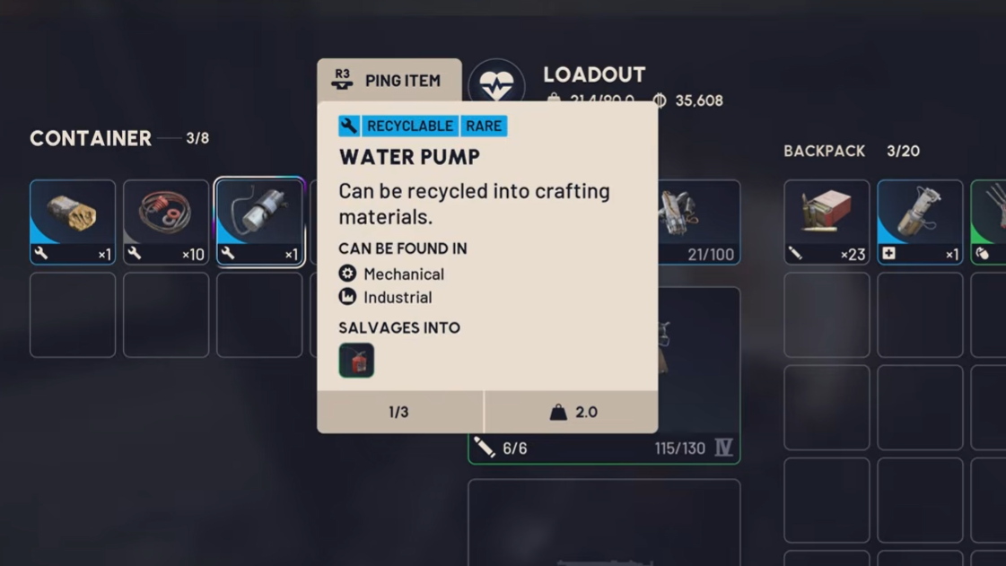 Everything else in the recyclable category — items like the Alarm Clock, Bicycle Pump, Frying Pan, Turbo Pump, and dozens more — can be safely recycled without worrying about future quest requirements or bench upgrades. Once you've turned in your Water Pump for Unexpected Initiative, any additional Water Pumps you find are free to recycle for Metal Parts and Oil.