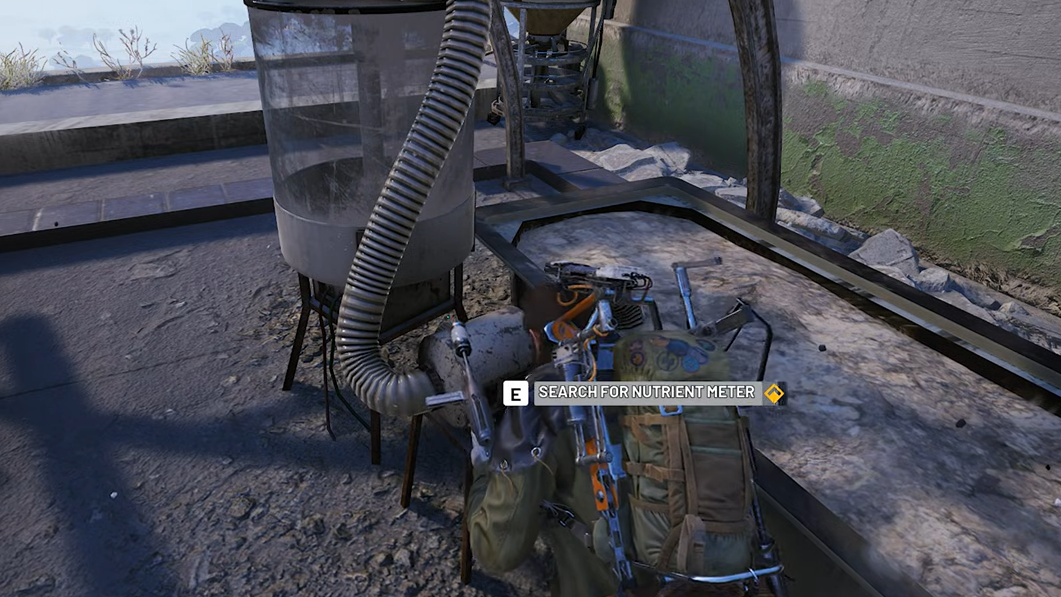 Step 3: On the rooftop, look for a large glass tank with a motor and hose attached, stuck into the soil of a planting bed. There are multiple spawn points — check both the northwest and southeast corners of the roof. Interact with the yellow icon on the tank and grab the Water Pump that drops.