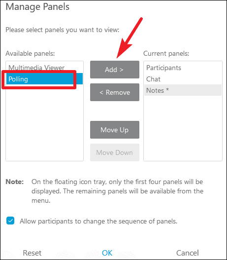 Now, select ‘Polling’ from under the ‘Available Panels’ area and click on the ‘Add’ button to move it to the ‘Current Panels’. Finally, click ‘OK’ to save the changes.