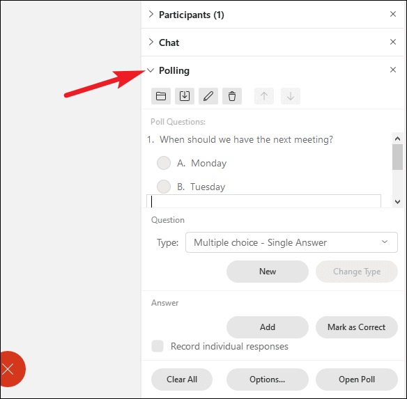 The panel for Polling will appear on the right side of the meeting window where the panels for participants, chats, etc., appear. From there, you can add questions and conduct polls with meeting participants.