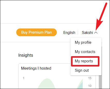 Go to webex.com on your browser and log in to your meeting space. Then, go to your name on the right corner of the screen, click on the down arrow, and select ‘My reports’ from the menu.