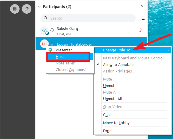 Open the ‘Participants’ panel and go to the attendee you want to make the new host. Right-click on their name and select ‘Change Role To’ from the menu. Then, select ‘Host’ from the sub-menu to make them the host.