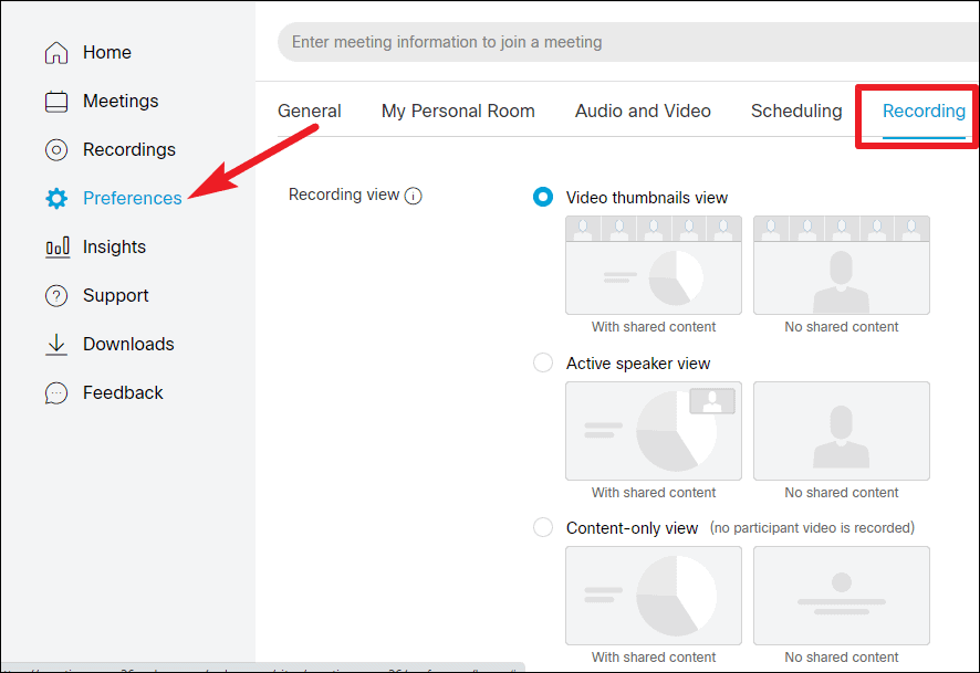 In the content-only view, the recording contains only the contents of the shared screen. And if there’s no content sharing session active, then it will only record the audio without any video. You can change the recording views only from the web portal, so it’s prone to escaping people’s notice.
