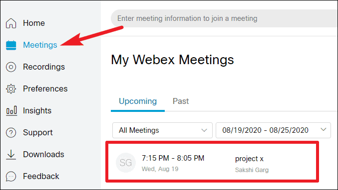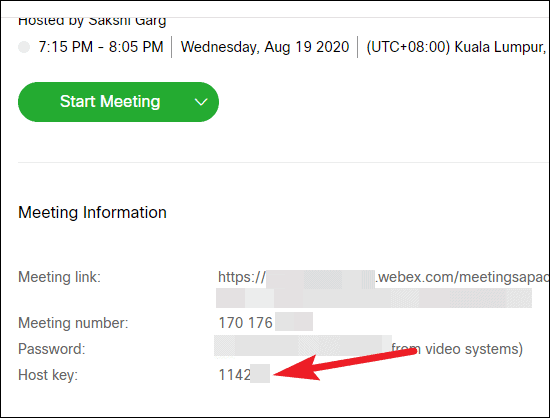 To view the key, log in to the Webex web portal and go to your meetings. Then, click on the scheduled meeting to view further details.
