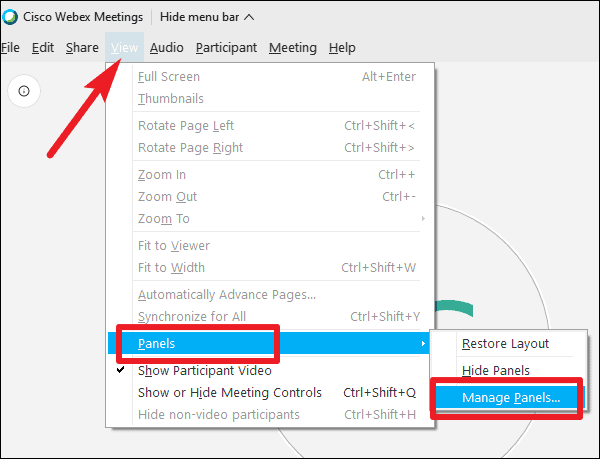 To add polling to a meeting, go to the Menu Bar in the meeting window and click on the ‘View’ option. Then, go to ‘Panels’ in the menu, and select ‘Manage Panels’ from the sub-menu.