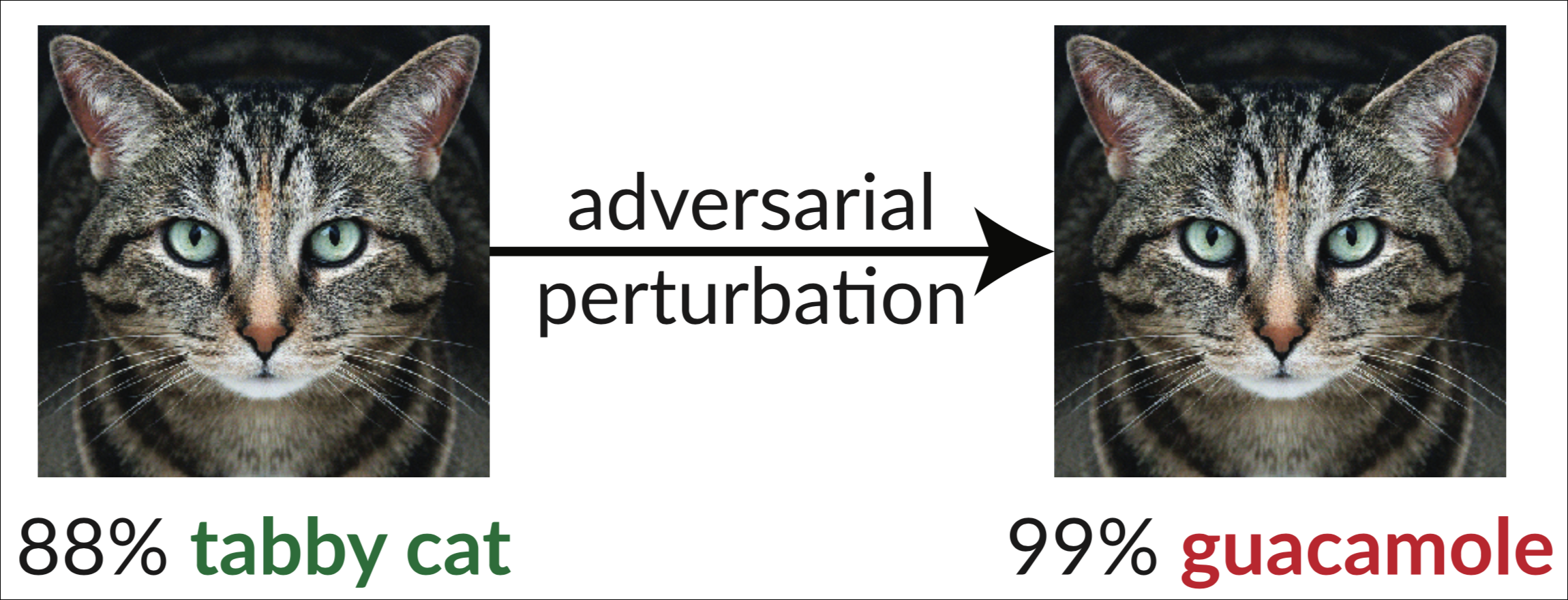 The changes aren’t glaringly obvious; to a human, the change wouldn’t be perceivable at all, as clear from the example above. No human reader would have trouble classifying the image on the right as a tabby cat. But introducing subtle changes to images, videos, text, or audio can fool the AI system into perceiving things not there or ignoring things that are, such as a Stop sign.
