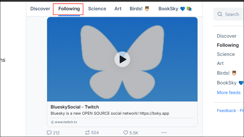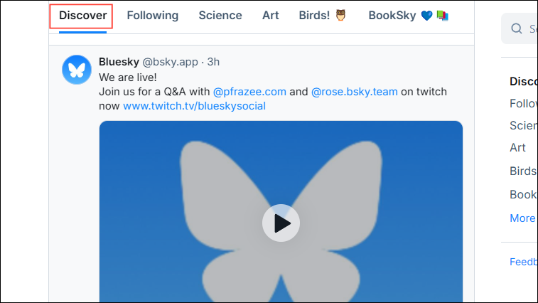 As mentioned before, Bluesky allows you to search for and follow feeds based on your interests and preferences. When you first sign up on the platform, you will be able to select your interests from a given list of options, which include topics like Science, Art, Nature, etc. Once you've selected your interests, you will see posts related to those interests in the default 'Discover' feed. This feed also shows you the most popular posts on the platform, making it easy to follow popular user accounts.