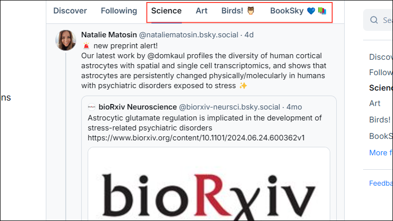 - Feed generators: Here you can see custom feeds created by organizations and users.